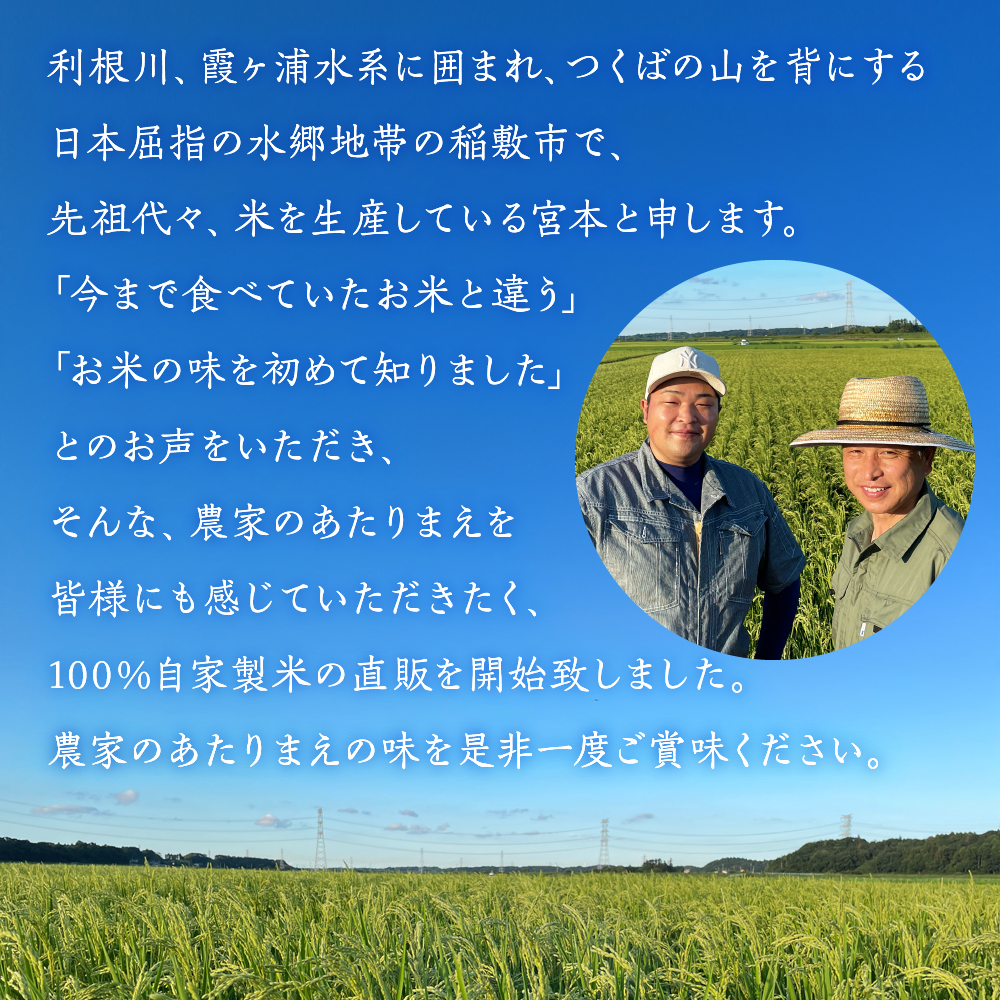 利根川、霞ケ浦水系に囲まれ、つくばの山を背にする日本屈指の水郷地帯の稲敷市でとれた美味しいお米です。